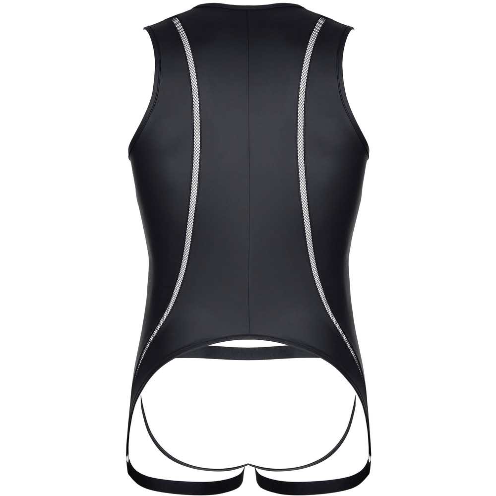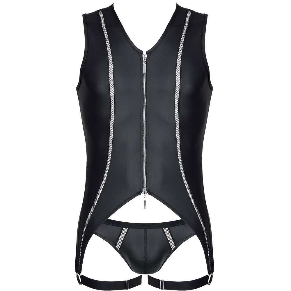 Body: Efektowne z czarnego wetlook’a. Z przodu po bokach pionowe elementy dekoracyjne z czarnej siateczki. Ekspres z przodu zapinany dwustronne z ozdobnymi suwakami. Body po bokach, u dołu kończy się poniżej linii pośladków paskami z czarnej, miłej w dotyku gumki z metalowymi regulatorami. Z tyłu kolisty kształt apetycznie i zmysłowo ukazuje nagie pośladki. Majtki typu jockstrap. Z przodu ozdobne siateczki po bokach. Na obwodzie bardzo miła, czarna gumka z metalicznym połyskiem. Dolne paski body, będące na udach oraz tylne paski od majtek efektownie podkreślają kształt nagich pośladków.