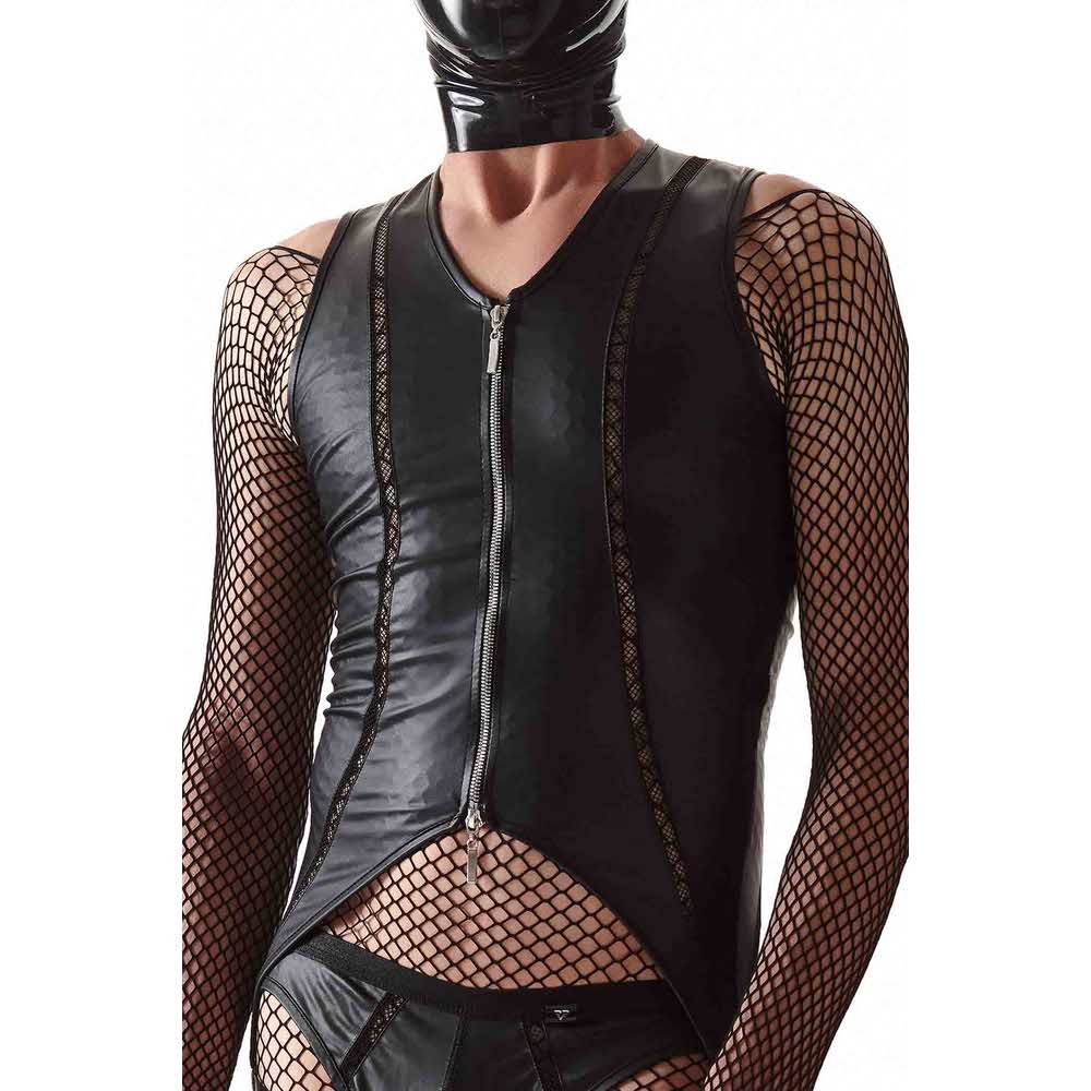 Body: Efektowne z czarnego wetlook’a. Z przodu po bokach pionowe elementy dekoracyjne z czarnej siateczki. Ekspres z przodu zapinany dwustronne z ozdobnymi suwakami. Body po bokach, u dołu kończy się poniżej linii pośladków paskami z czarnej, miłej w dotyku gumki z metalowymi regulatorami. Z tyłu kolisty kształt apetycznie i zmysłowo ukazuje nagie pośladki. Majtki typu jockstrap. Z przodu ozdobne siateczki po bokach. Na obwodzie bardzo miła, czarna gumka z metalicznym połyskiem. Dolne paski body, będące na udach oraz tylne paski od majtek efektownie podkreślają kształt nagich pośladków.