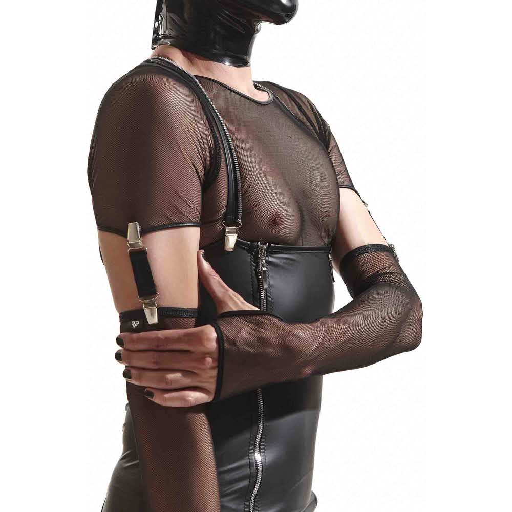 Długie rękawiczki wykonane z czarnej, elastycznej siateczki. Sięgające od połowy dłoni za łokieć. Dodatkowe wycięcie na kciuk. Świetnie dopasowują się do dłoni i przedramion, podkreślając i ukazując ich kształt. Dodatkowo w zestawie są elastyczne paski ze srebrnymi, metalowymi zapięciami. Służą do przypinania rękawiczek do koszulki – dzięki czemu rękawiczki nie zsuwają się i efektownie się prezentują. Zapięcia pasków są trwałe, metalowe i wodoodporne. Produkt sprzedawany w pudełku z logo RFP – bez spersonalizowanego zdjęcia.