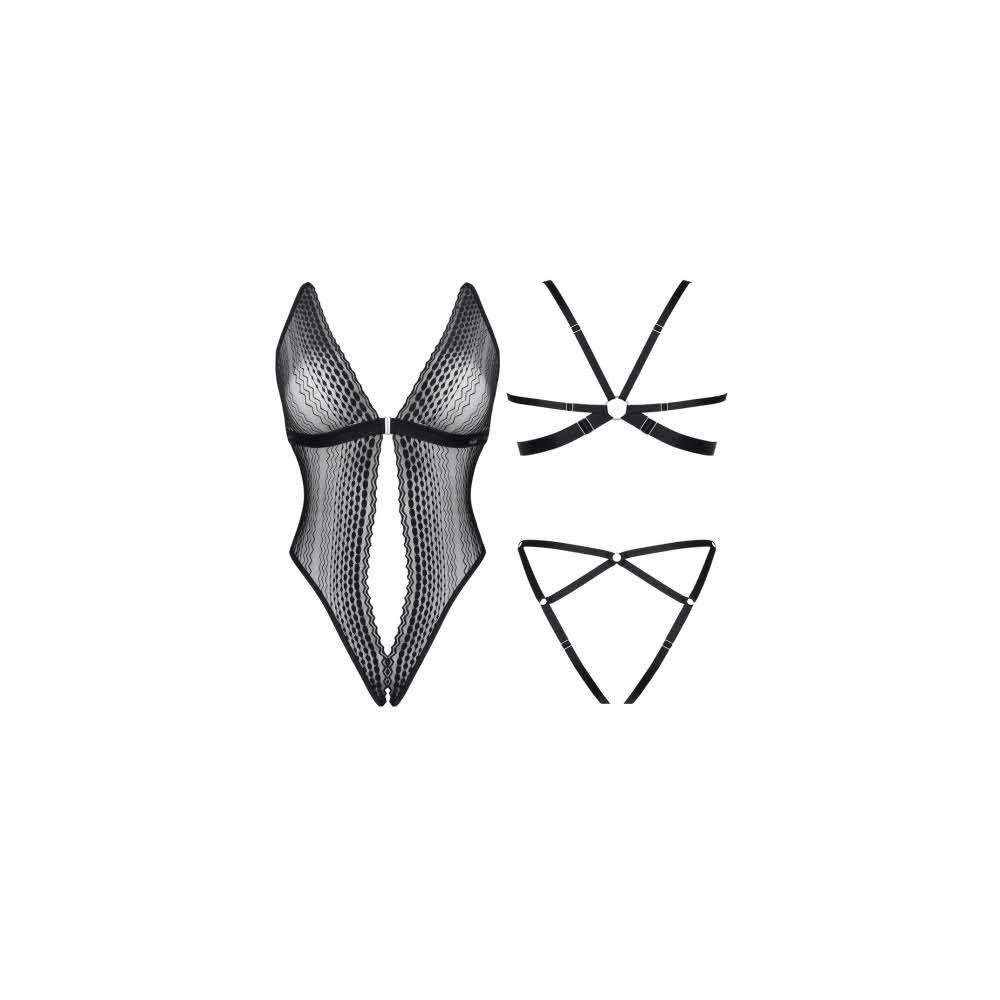 Body z miłej w dotyku, czarnej koronki w geometryczne, pionowe wzory. Efektowne pionowe wycięcie z przodu. Z tyłu atrakcyjna kompozycja z gumek ze srebrnym metalowym kółkiem i srebrnymi, metalowymi regulatorami. Dzięki licznym regulatorom, komplet można idealnie dopasować do ciała. Rozwiązanie typu: 'open bottom’. Pudełko spersonalizowane ze zdjęciami produktu.