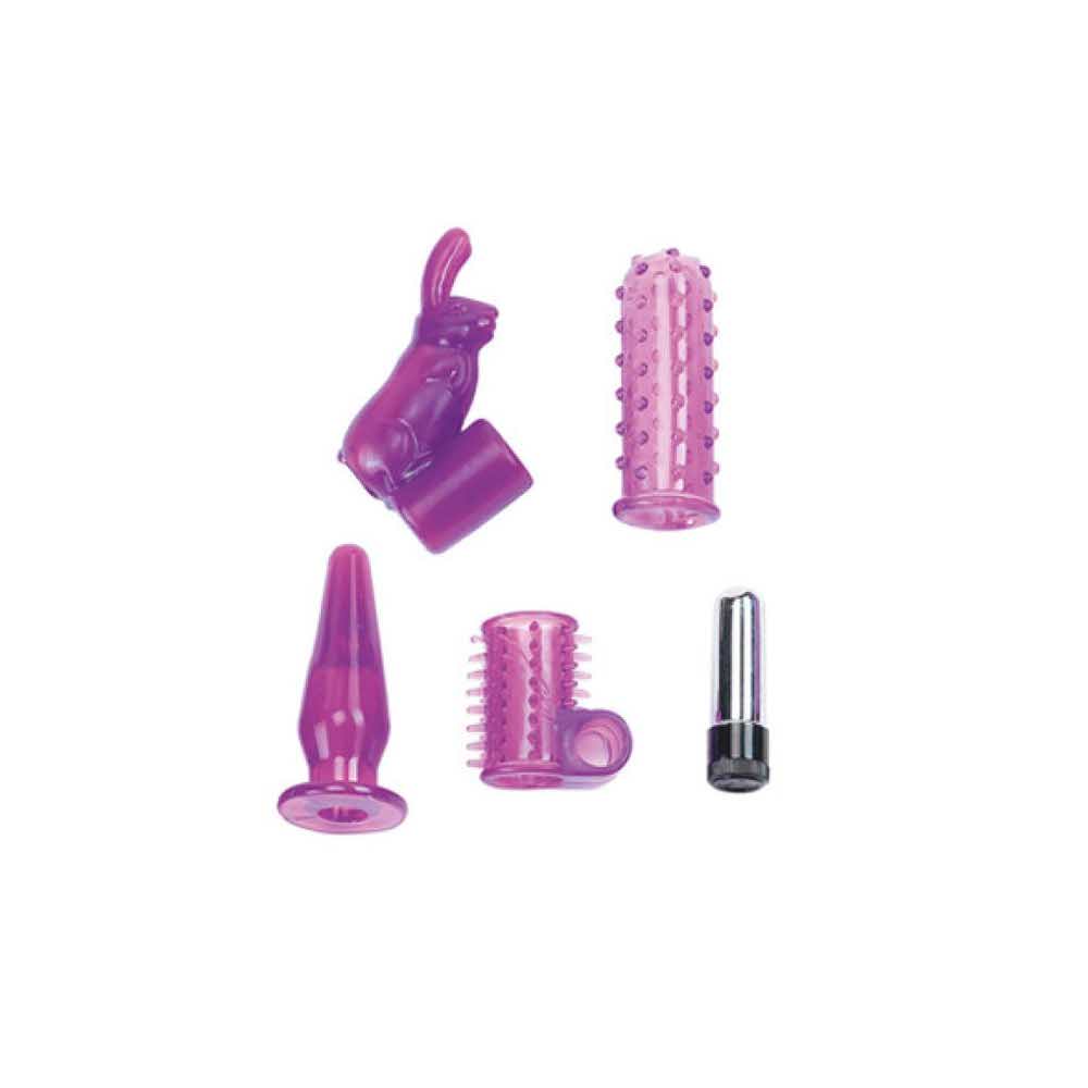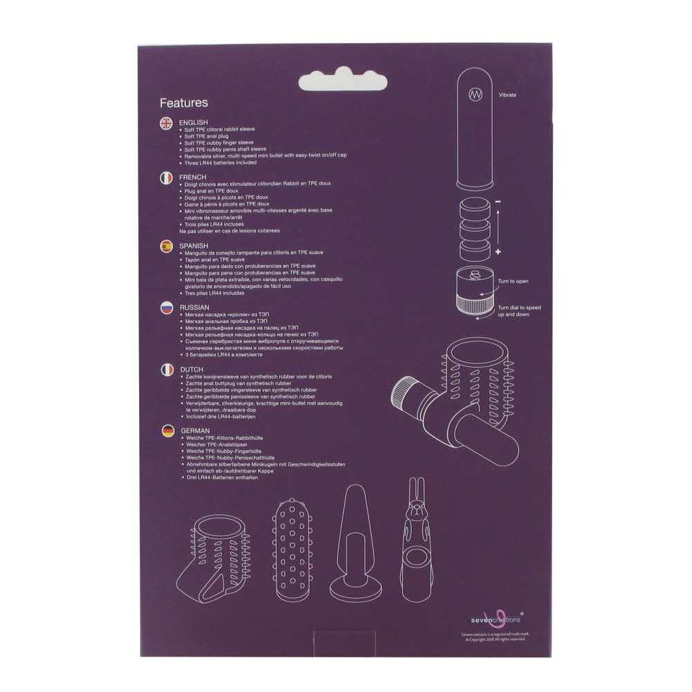 Wspaniały zestaw dla urozmaicenia łóżkowych igraszek. Wykonany z silikonu zestaw czterech nakładek w komplecie ze srebrnym i wodoodpornym mini wibratorem.