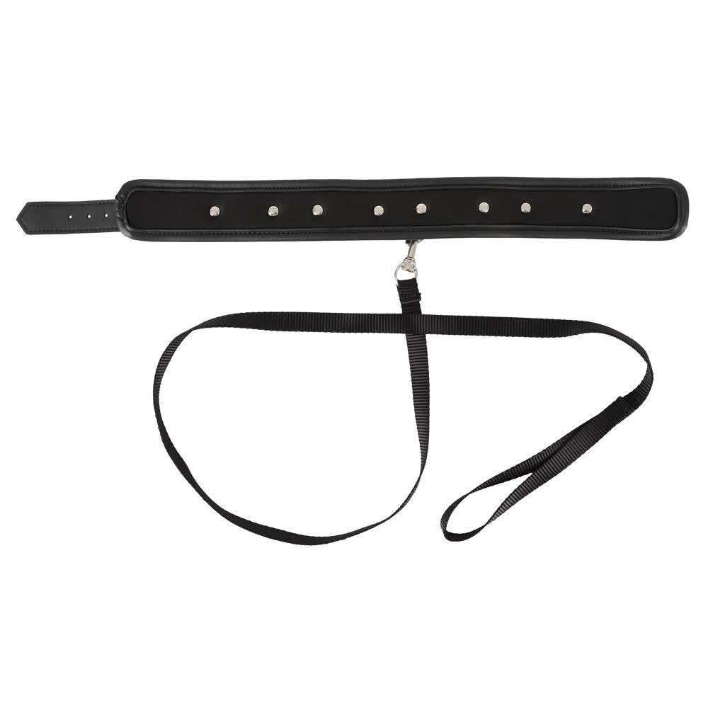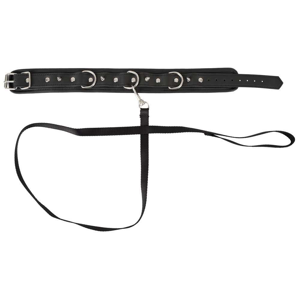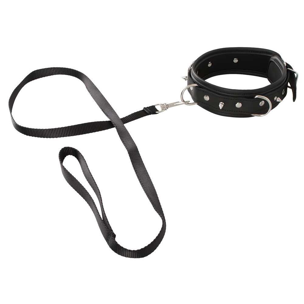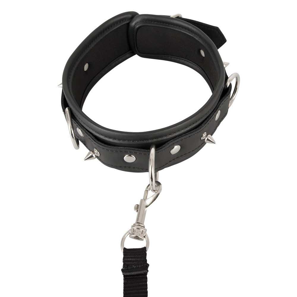 Kołnierz i smycz w zestawie! Mankiet na szyi w skórzanym stylu jest miękko wyściełany i imponuje ozdobnymi kolcami i pierścieniami D-ring. Smycz z paskiem jest zdejmowalna. Vegan. Obwód wiązania regulowany od 37-47 cm smycz 112 cm długości. Poliuretan, metal.