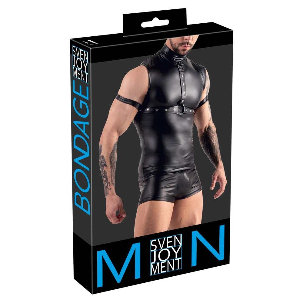 Ekskluzywny, urzekający design!Bluzka Svenjoyment Bondage wykonana z modnego, matowego czarnego materiału z szelkimi (nieodpinanymi) zapinanymi na ćwieki. Uprząż ma po obu stronach pierścienie na dołączone pętle na ramiona, które krępują ramiona. Matowe p