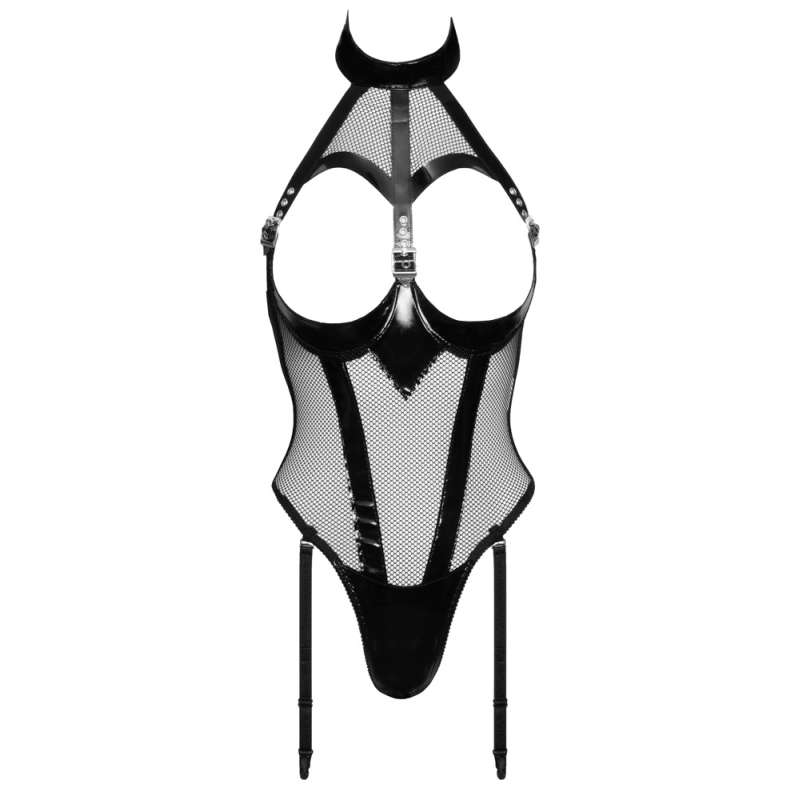 Erotyczna prowokacja! To body marki Black Level porywająco eksponuje biust, który jest pięknie podkreślony dzięki regulowanym paskom z klamerkami. Przód wykonany jest z eleganckiej mieszanki błyszczącego winylu i siatki. Z tyłu wstawka z elastycznego materiału zapewnia wygodne dopasowanie do skóry. Dekolt zapinany na zatrzask. Paski do pończoch mają regulowaną długość, a nawet można je całkowicie odpiąć. 50% poliamid, 50% poliester, powłoka poliuretanowa. Bez pończoch.