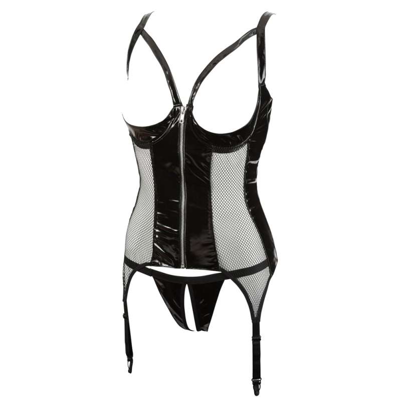 Co za show! Koszulka z podwiązkami marki Black Level w ekscytujący sposób eksponuje biust, który jest pięknie podkreślony i podtrzymany dzięki zintegrowanym fiszbinom i paskom na miseczkach. Przód wykonany jest ze stylowej mieszanki błyszczącego winylu i siatki. Elastyczna wstawka z tyłu zapewnia wygodne dopasowanie do skóry. Z przodu znajduje się zamek błyskawiczny na całej długości, który ułatwia zakładanie i zdejmowanie. Paski do pończoch mają regulowaną długość. W komplecie winylowe stringi bez krocza z rozcięciem. 98% poliester, 2% elastan, powłoka poliuretanowa siatka 100% poliester. Bez pończoch.