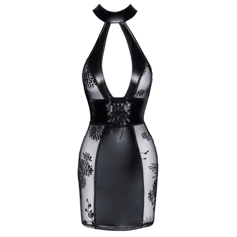 Rewelacyjne połączenie materiałów! Krótka sukienka marki Noir o obcisłym kroju z opaską na szyję typu halterneck. Obszerny dekolt z przodu i podkreślające talię sznurowanie pod spodem. Górna część pleców pozostaje wolna, pod spodem znajduje się zamek błyskawiczny ułatwiający ubieranie i rozbieranie. Mieszanka materiałów o stylowym matowym wyglądzie z aksamitnymi nadrukami flokowymi po bokach doskonale przylega do skóry i jest niezwykle wygodna w noszeniu. 76% poliester, 24% elastan, powłoka polimerowa przezroczyste wstawki 82% poliester, 18% elastan. Dla Noir istnieje osobna tabela rozmiarów.