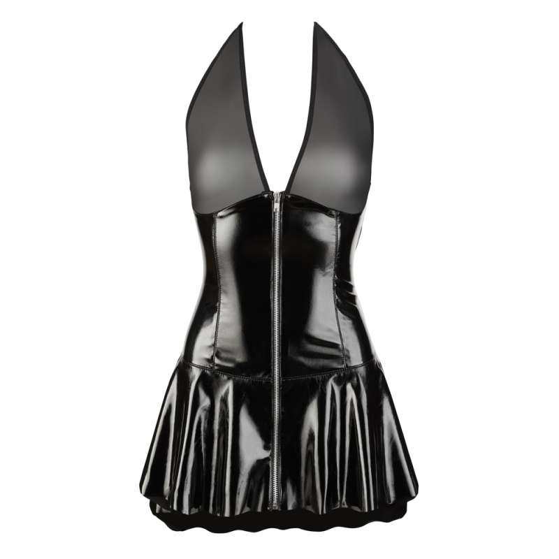 Lakierowy połysk i przejrzystość uwodzicielsko połączone! Krótka sukienka marki Black Level w całości z czarnym patentowym połyskiem, z miseczkami i dekoltem halter z powernetu. Fason dopasowany do sylwetki, z rozkloszowaną spódnicą, która z tyłu jest nieco dłuższa niż z przodu. Zamek błyskawiczny na całej długości biegnie od dekoltu w szpic do dołu z przodu. 100% poliester, powłoka poliuretanowa powernet 95% poliamid, 5% elastan.