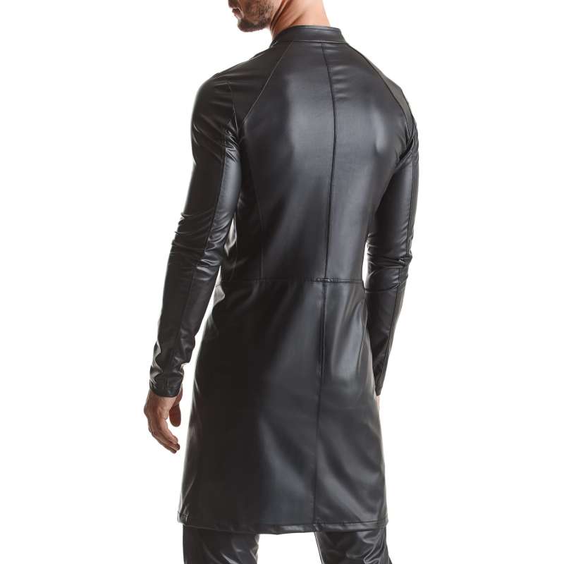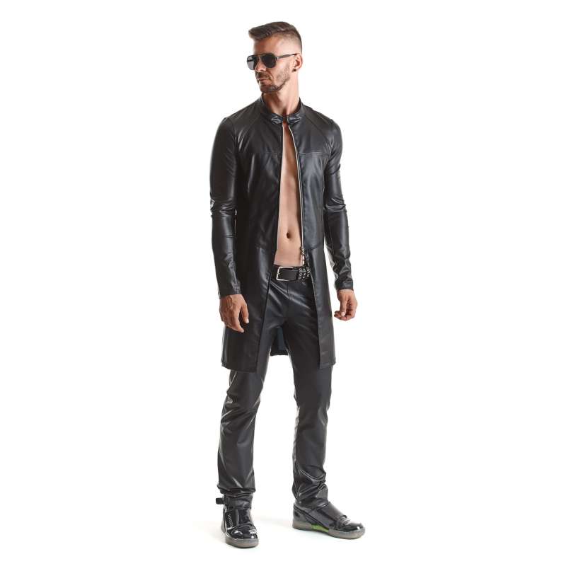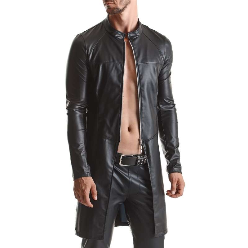Efektowny płaszcz zdecydowanie wyróżniający się kształtem oraz licznymi rozwiązaniami konstrukcyjnymi, przygotowanymi w celu idealnego podkreślenia sylwetki i proporcji ciała. Wykonany z czarnego wysokiej klasy wetlook’a. Jest miły w dotyku i elastyczny, a w przypadku tego modelu to ważne, gdyż po zapięciu dokładnie przylega do ciała. Z przodu poziome i skośne przeszycia wyglądają same w sobie oryginalnie, ale jedocześnie wzmacniają efekt ekspozycji klatki piersiowej i linii pasa. Podobnie na plecach – w górnej części skośne przeszycia optycznie poszerzają plecy i wyglądają unikalnie. Z przodu dopasowanie produktu ułatwia srebrny ekspres. Jest także elementem ozdobnym i przyjemnym do różnego typu zabaw, gdyż można go odpinać z góry i z dołu. Czerwone przeszycia i czerwona metka z Alcantary to już cudownie dopracowane detale. Płaszcz RMMario001 doskonale nadaje się zarówno na wyrafinowane imprezy fetyszowe jak i do codziennych stylizacji.