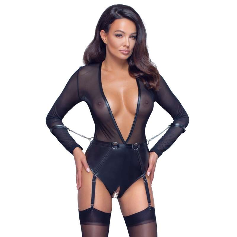 Przepiękne body marki Cottelli Bondage z ekstremalnie głębokim dekoltem. Górna część body wykonana z przezroczystej siateczki, zaś majteczki z matowej tkaniny- idealny strój na spontaniczny sex! Całość podkreślona matowymi paskami oraz pierścieniami. W komplecie kajdanki, które można przymocować za pomocą łańcuszków z karabińczykami do pierścieni w talii. Całkowicie otwarte krocze. Regulowane paski do pończoch są odpinane.