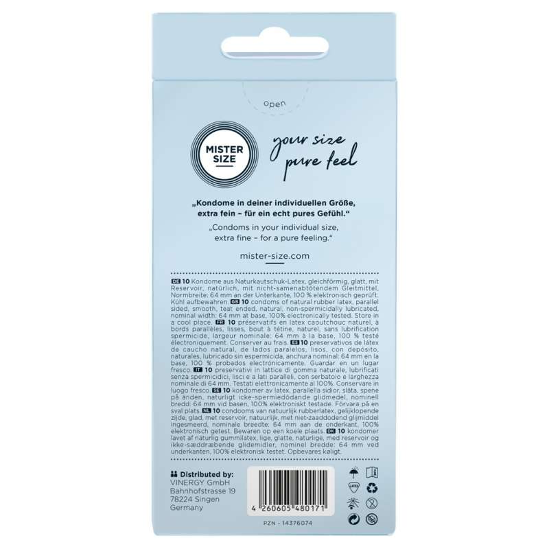 Doświadcz jeszcze WIĘCEJ wrażeń! Przezroczyste, niezwykle cienkie prezerwatywy wykonane z naturalnego lateksu, są pokryte lubrykantem i zakończone smoczkiem. Wegańskie. Mężczyzna/kobieta może wybrać odpowiedni rozmiar prezerwatywy dla penisa, korzystając z szerokiej, ciemnoniebieskiej skali pomiarowej znajdującej się z przodu opakowania.