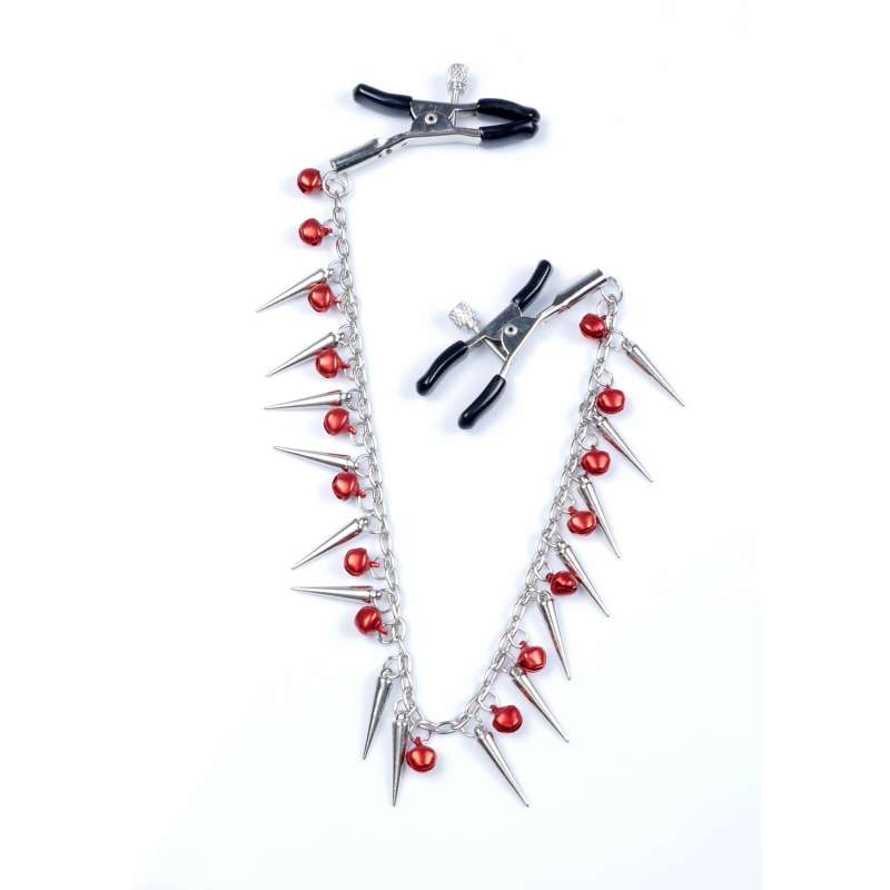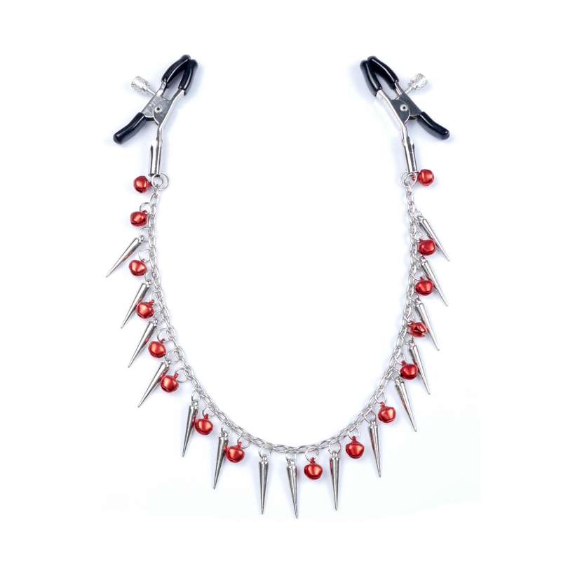 Wytrzymałe metalowe zaciski pokryte miękką gumą, te zaciski są idealne dla początkujących jak i entuzjastów. Siłę zacisku brodawki można regulować obracając śrubę, Elegancki łańcuszek z małymi dzwoneczkami oraz zdobieniami łączy oba sutki, daje to niesamowitą stymulację przy każdym ruchu.