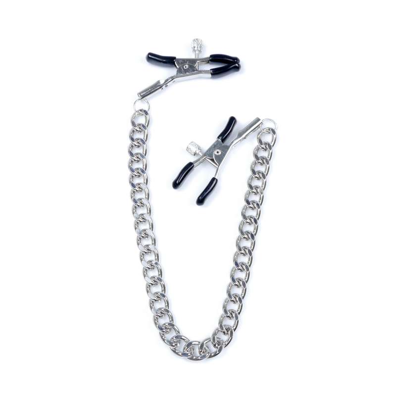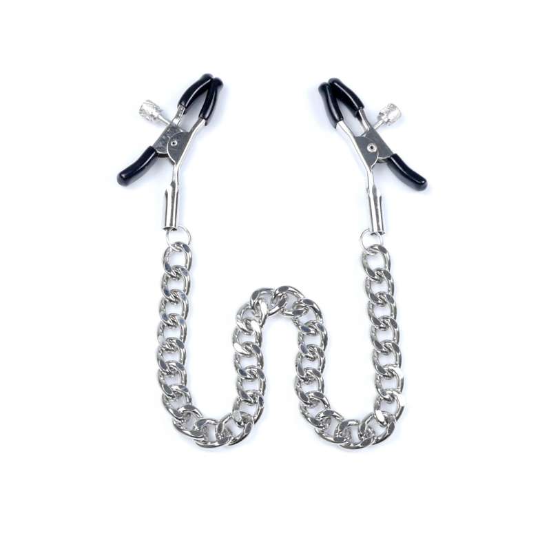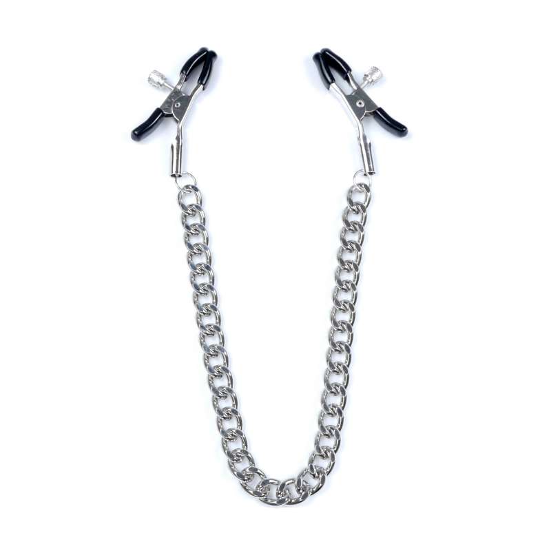 Wytrzymałe metalowe zaciski pokryte miękką gumą, te zaciski są idealne dla początkujących jak i entuzjastów. Siłę zacisku brodawki można regulować obracając śrubę, Elegancki łańcuszek łączy oba sutki, daje to niesamowitą stymulację przy każdym ruchu.