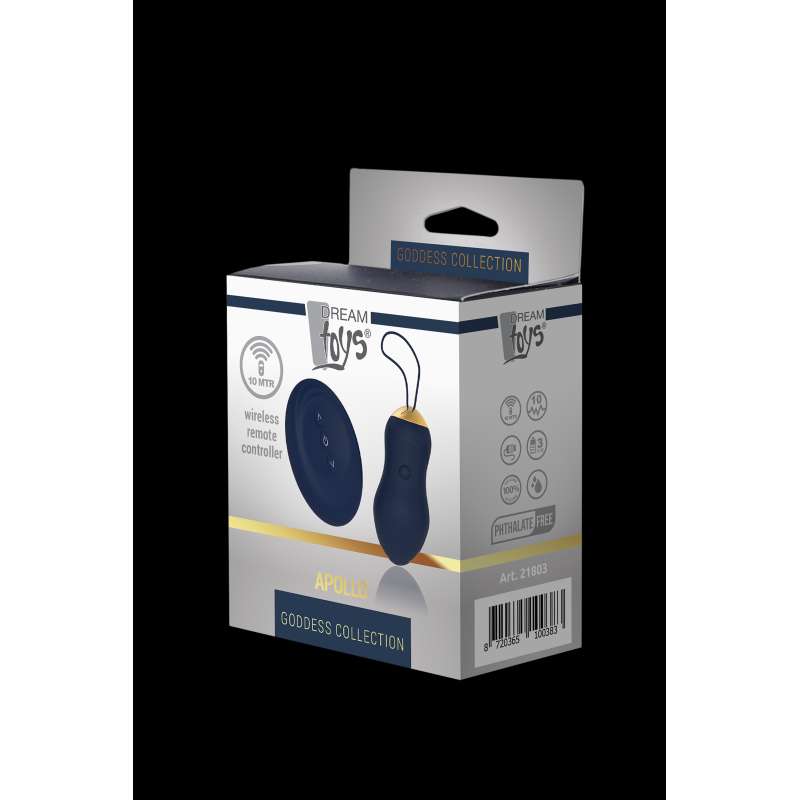 Apollo to wibrujące jajko z pilotem. Doskonały do wewnętrznej stymulacji dzięki łatwej obsłudze i mocnemu sznurkowi do łatwego wyjmowania. Jajko Apollo ma wyrafinowany wygląd dzięki gładkiemu kształtowi, ciemnoniebieskiemu silikonowi i złotym detalom. To jajko przyjemności oferuje 7 rytmów wibracji z 3 prędkościami, więc zawsze istnieje wibracja dostosowana do potrzeb użytkownika. Wibracje można łatwo regulować podczas użytkowania za pomocą przycisków strzałek na bezprzewodowym pilocie zdalnego sterowania o zasięgu 10 metrów. Zarówno jajko, jak i pilot można ładować za pomocą dołączonego kabla USB.