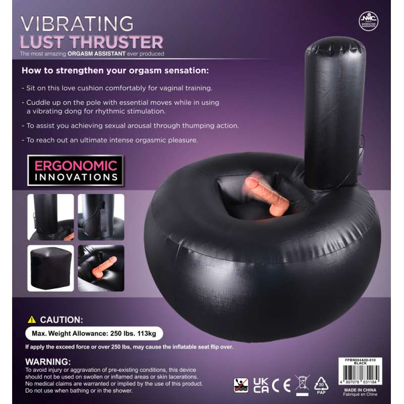 Gorące przejażdżki na komfortowej wyspie przyjemności! Szybko rozpalająca wyspa przyjemności Vibrating Lust Thruster marki NMC z wbudowanym wibratorem naturalnym. Z kolumną nośną z poduszką powietrzną i oddzielną poduszką powietrzną do komfortowej jazdy wibratora. Zintegrowany naturalny wibrator z chwytliwymi jądrami jest pięknie elastyczny i stymuluje swoją wyraźną żołędzią i charakterystycznym żyłkowaniem. Dodatkowo 10 rytmicznych trybów wibracji można wygodnie kontrolować za pomocą przewodowego pilota. Pilot można również umieścić w kieszeni na kolumnie nośnej, co pozwala na swobodniejszą i bardziej dziką jazdę. Poduszka powietrzna na środku wyspy jest wyjmowana w celu łatwego czyszczenia. Nadmuchiwana wyspa może być obciążona maksymalnie do 113 kg. Baterie prosimy zamawiać osobno: 3 x AAA. Wyspa: średnica 95 cm (obwód 298,5 cm), wysokość 36 cm kolumna o wysokości 51 cm, średnica 20,7 cm (obwód 65 cm). Powierzchnia poduszki 31 x 34 cm. Wibrator: długość całkowita 16,5 cm, długość wkładki 13 cm, średnica max. 4 cm.