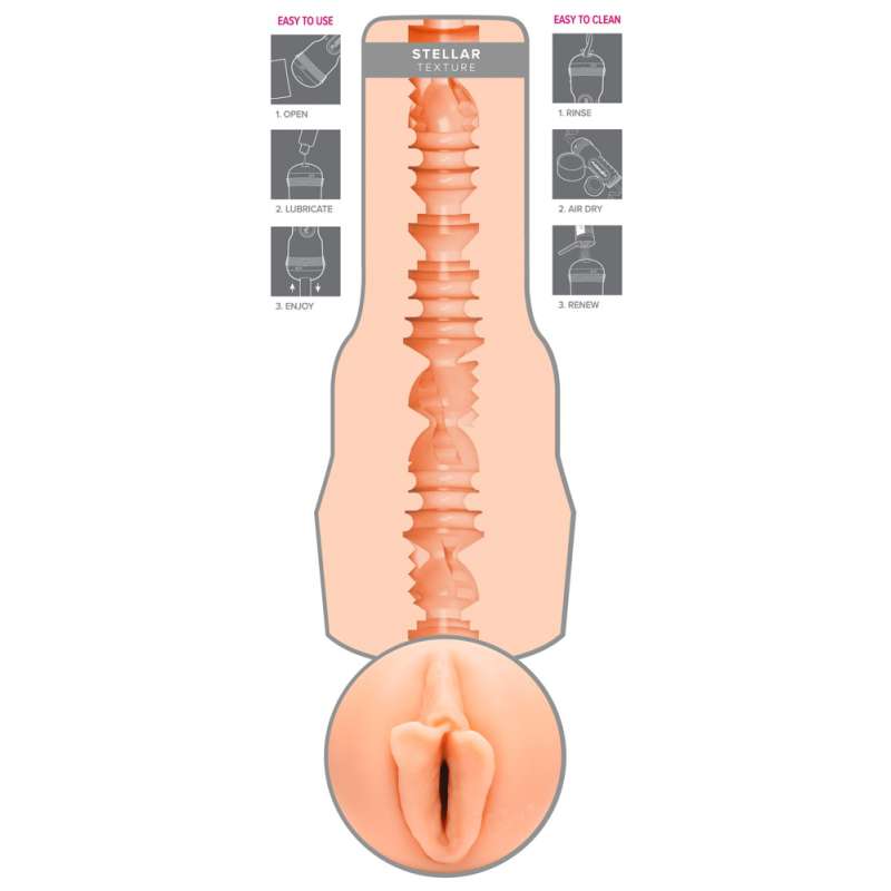 Pierwszorzędna przyjemność z intensywną strukturą stymulacji! Masturbator Grip Gina Valentina Stellar marki Fleshlight w dyskretnym wyglądzie latarki z oryginalnie wyprofilowanym otworem na pochwę gwiazdy erotyki Giny Valentiny. Ponadto bardzo zróżnicowane wnętrze o różnych średnicach bardzo blisko przylega do ciasnej pochwy Giny i zapewnia intensywny, skuteczny dla orgazmu masaż podczas handjob. Wewnętrzny rękaw wykonany z super miękkiego materiału przypominającego skórę ma autograf Giny obok otworu i może być łatwo usunięty z masturbatora do czyszczenia. Całkowita długość/głębokość wkładania 25 cm, wewnętrzna średnica szczelna i rozciągliwa. TPE, ABS.