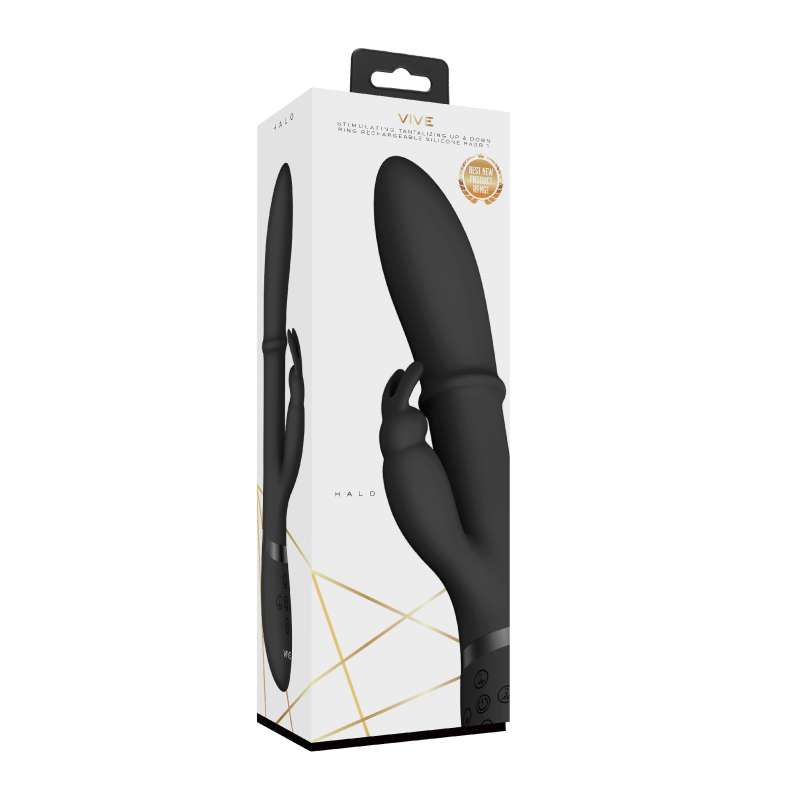 Marka VIVE High Class oznacza niezrównaną stymulację w wyniku ciągłych innowacji! Ten wibrator króliczek/punktu G z górnej półki może pochwalić się wyjątkową funkcją, która sprawi, że Twoje palce u stóp wygną się w rozkoszy. Ma stymulujący pierścień wbudowany w gładki trzon z medycznego silikonu, który porusza się w górę i dół, zapewniając wewnętrzny’ masaż, jak żaden inny. Pierścień ma 10 różnych trybów prędkości, a zarówno stymulator punktu G, jak i stymulator króliczek, mają po 10 różnych trybów wibracji, co daje kosmiczną liczbę kombinacji ustawień do wyboru.Wibrator VIVE HALO ma klasę wodoodporności IPX7 i działa na akumulator. 120 minut ładowania dostarcza 40 minut nieposkromionej przyjemności z głośnością poniżej 60dB.