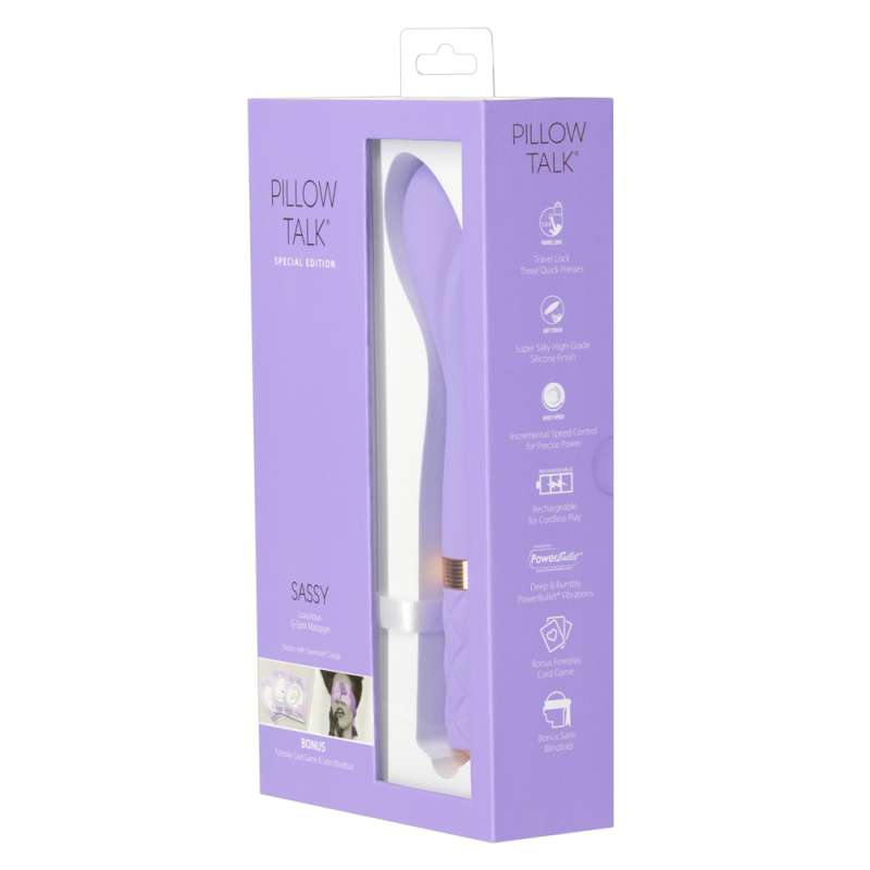 Edycja specjalna: wibrator Sassy z grą karcianą i satynową chustą! Edycja specjalna Sassy od Pillow Talk zaprasza na rozmowy do poduszki. Popularnemu wibratorowi Sassy towarzyszy ekscytująca gra karciana dla par z inspiracjami do gry wstępnej oraz wysokiej jakości satynowa chusta jako opaska na oczy lub dla urzekających chwil. Stylowy wibrator intensywnie rozpieszcza pochwę dzięki wypukłym rowkom stymulacyjnym na trzonie i celuje w punkt G dzięki idealnie zakrzywionej główce. Dzięki aksamitnej, miękkiej w dotyku powierzchni, jak za dotknięciem czarodziejskiej różdżki trafia do celu. Mocny silnik Powerbullet oferuje ekscytującą stymulację głębokimi drganiami, które można regulować stopniowo i precyzyjnie za pomocą przycisku. Przycisk sterujący mieni się szlachetnym kamieniem Swarovskiego®! Kolejnymi zaletami są funkcja zwiększania mocy przez naciśnięcie i przytrzymanie, funkcja szybkiego wyłączania umożliwiająca natychmiastowe wyłączenie oraz praktyczna blokada przycisków. Możliwość ładowania – w zestawie kabel USB do ładowania. Wibrator: długość całkowita 20 cm, średnica 3,8 cm. Silikon. Szalik satynowy: 100% poliestru.