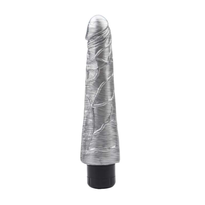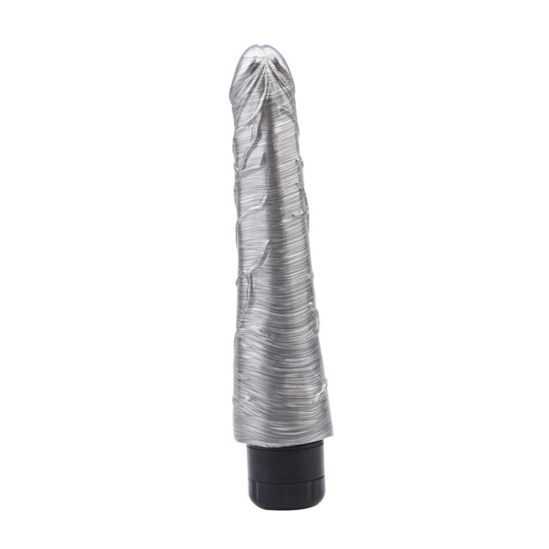 Realistyczny wibrator w kolorze srebrnym. Posiada wyraźną główkę, z wytłoczonymi żyłami dla dodatkowej stymulacji. Przyjemne w dotyku, bez szwów. Regulacja wibracji za pomocą kółka u podstawy. Wyposażony w wibracje o różnej prędkości, zasilany dwiema bateriami AA (nie dołączone).
